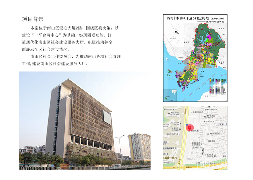 | 設(shè)計(jì)說(shuō)明 | 本案位于南山區(qū)愛(ài)心大廈2樓。圍繞區(qū)委決策,以建設(shè)“一平臺(tái)兩中心”為基礎(chǔ),實(shí)現(xiàn)四項(xiàng)功能。打造現(xiàn)代化南山區(qū)社會(huì)建設(shè)服務(wù)大廳,積極推動(dòng)并全面展示全區(qū)社會(huì)建設(shè)情況。 | ||||