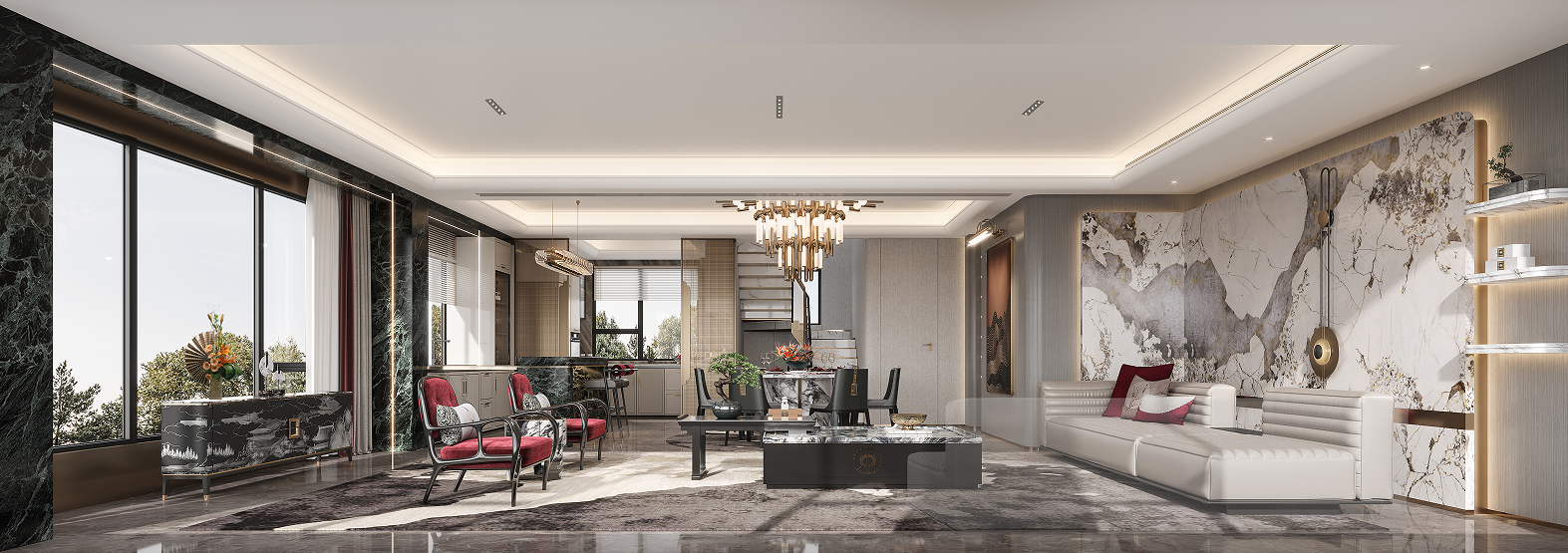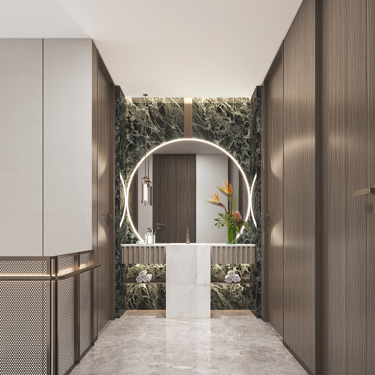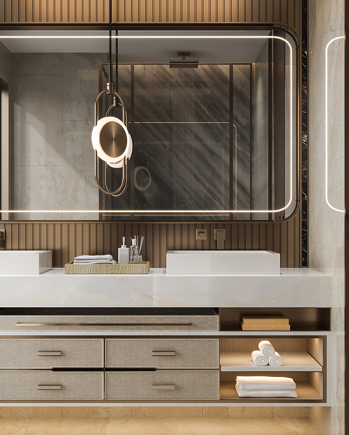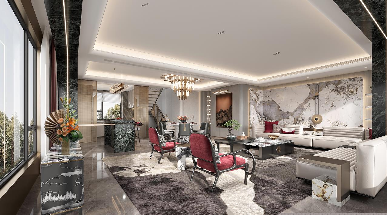 一層以“見山”為題,強(qiáng)調(diào)一種寬廣的、壯闊的詩(shī)意生活。基于建筑條件中極具優(yōu)勢(shì)的景觀資源條件,整體空間以“向外打開”的通透意境處理界面與層次關(guān)系,渾厚而瑩潤(rùn)的古銅色調(diào)以匹配大開大合的空間尺度而營(yíng)造出居室特有的生活氛圍。開門見山,獨(dú)享豁達(dá)人生。
