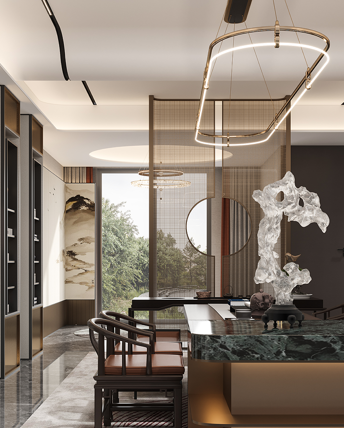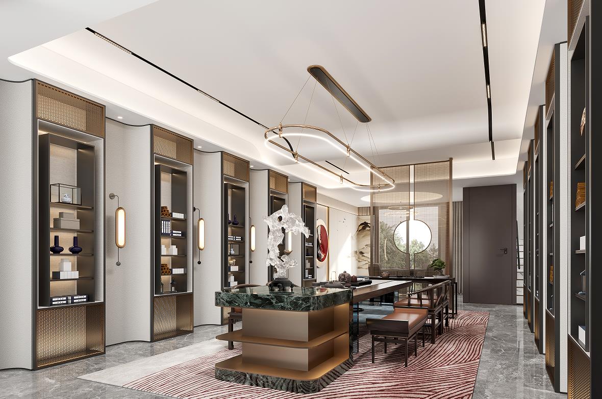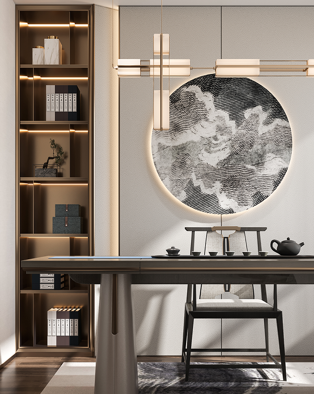 負(fù)一層會(huì)客廳打造為男主人的社交空間,精致的茶臺(tái),私享的收藏展閱,是屬于和朋友閑談、聊天的專屬場(chǎng)所。